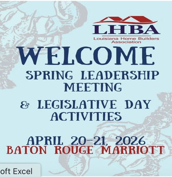 Join fellow members for the 2026 Spring Leadership Meeting & LHBA's Annual Legislative Day activities in Baton Rouge. Event details include LHBA Committee/Council meetings, a meeting of the LHBA Board of Directors, advocating for housing affordability at the Capitol and enjoying delicious crawfish and spirits with members and legislators alike! LHBA's Annual Legislative Day Crawfish Boil will be held at the Capitol Park Museum on Tuesday, April 21, 2026 beginning at 5:30 p.m. Registration is through the Louisiana Home Builders Association. To register please click here.